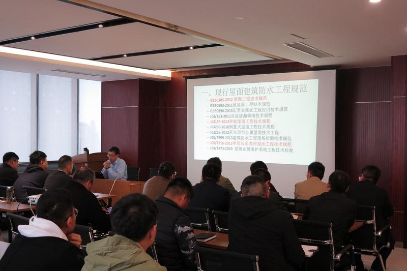 培訓總時長約2小時,邀請中國建材檢驗認證集團蘇州有限公司的防水專家朱志遠作為本次會議的主講嘉賓,旨在增強相關技術人員在實際防水工程中質量控制,了解現(xiàn)行規(guī)范及行業(yè)趨勢,提高防水意識。培訓中,朱志遠專家針對屋面防水材料及應用、《屋面工程技術規(guī)范》、《坡屋面工程技術規(guī)范》、《種植屋面工程技術規(guī)程》、《單層防水卷材屋面工程技術規(guī)程》、施工技術和施工過程中易出現(xiàn)的問題和誤區(qū)進行了詳細的培訓講解。