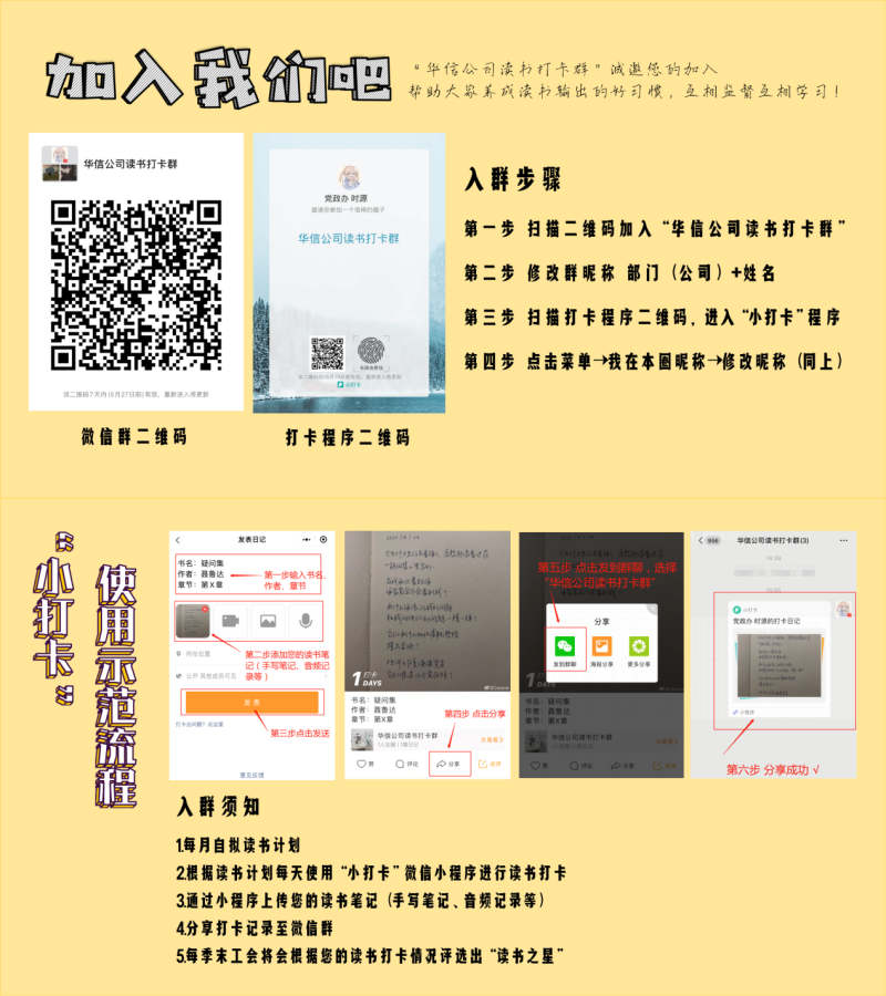 活動最后,為幫助大家養(yǎng)成讀書輸出的好習(xí)慣,工會建立了“華信公司讀書打卡群”并邀請廣大會員加入,依托微信程序“小打卡”進行線上讀書分享,每日上傳讀書筆記、感悟等,季末評選出一名“讀書之星”。會員們紛紛表示,線上+線下結(jié)合方式十分新穎,能夠起到互相監(jiān)督、互相學(xué)習(xí)的作用。