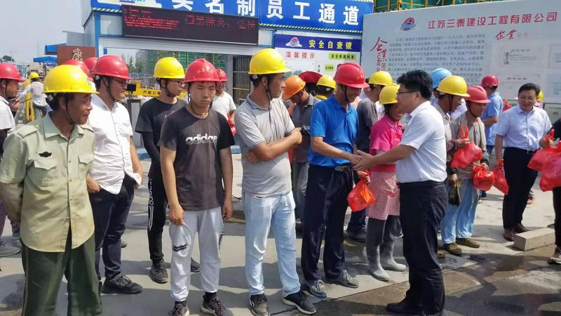 連日來(lái),我市烈日當(dāng)空,持續(xù)高溫,為改善夏季工作條件,對(duì)依舊堅(jiān)持在烈日下工作的一線(xiàn)職工表達(dá)敬意和關(guān)懷,加強(qiáng)高溫期間職工勞動(dòng)保護(hù)工作,推動(dòng)企業(yè)落實(shí)防暑降溫措施,2019年8月7日上午,醫(yī)藥高新區(qū)組織部部長(zhǎng)葛立網(wǎng),住建局局長(zhǎng)朱葉青、副局長(zhǎng)洪一琤在華信公司董事長(zhǎng)張由鳳、總經(jīng)理?xiàng)铊\等一行的陪同下來(lái)到康澤花園一期、醫(yī)藥城小學(xué)項(xiàng)目現(xiàn)場(chǎng),對(duì)現(xiàn)場(chǎng)工作人員進(jìn)行高溫慰問(wèn),為這個(gè)炎熱的夏季送來(lái)清涼。